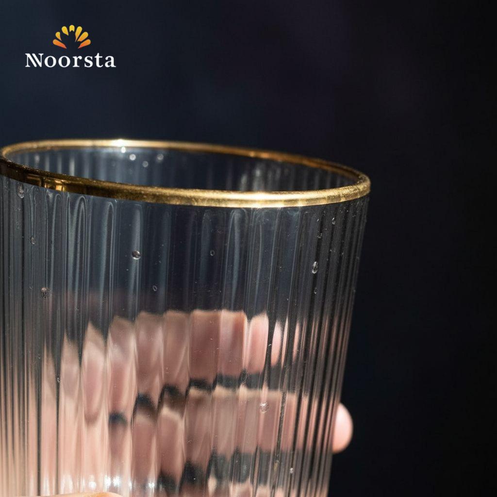 مصنوعة من زجاج عالي الجودة وشديد النقاء، وتتوج كل قطعة بحافة ذهبية رقيقة تضيف لمسة من الفخامة إلى مائدتك. التصميم الهندسي المضلع يخلق عمقاً بصرياً ساحراً، مما يجعل هذه الأكواب حديث الضيوف في التجمعات العائلية أو العشاء الرسمي. جدد مجموعة أدوات الشرب الخاصة بك مع طقم يجسد وعد نورستا بالجودة والأناقة.